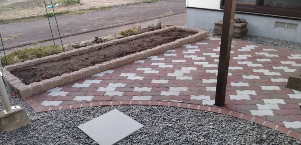 裏庭をかわいい雰囲気にしたいという事で工事依頼。花壇のブロックをボーダーストーンに変更し、砂利や土の部分にはインターロッキングを敷設